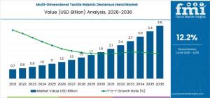 The Multi-Dimensional Tactile Robotic Dexterous Hand Market is transitioning from experimental adoption to commercial relevance as robotics moves beyond basic pick-and-place functions. According to recent market data, the market is projected to grow from USD 1.2 billion in 2026 to USD 3.8 billion by 2036, registering a robust CAGR of 12.2%. This expansion reflects rising demand for robotic systems capable of handling fragile, irregular, or variably oriented objects without excessive fixturing or retooling.